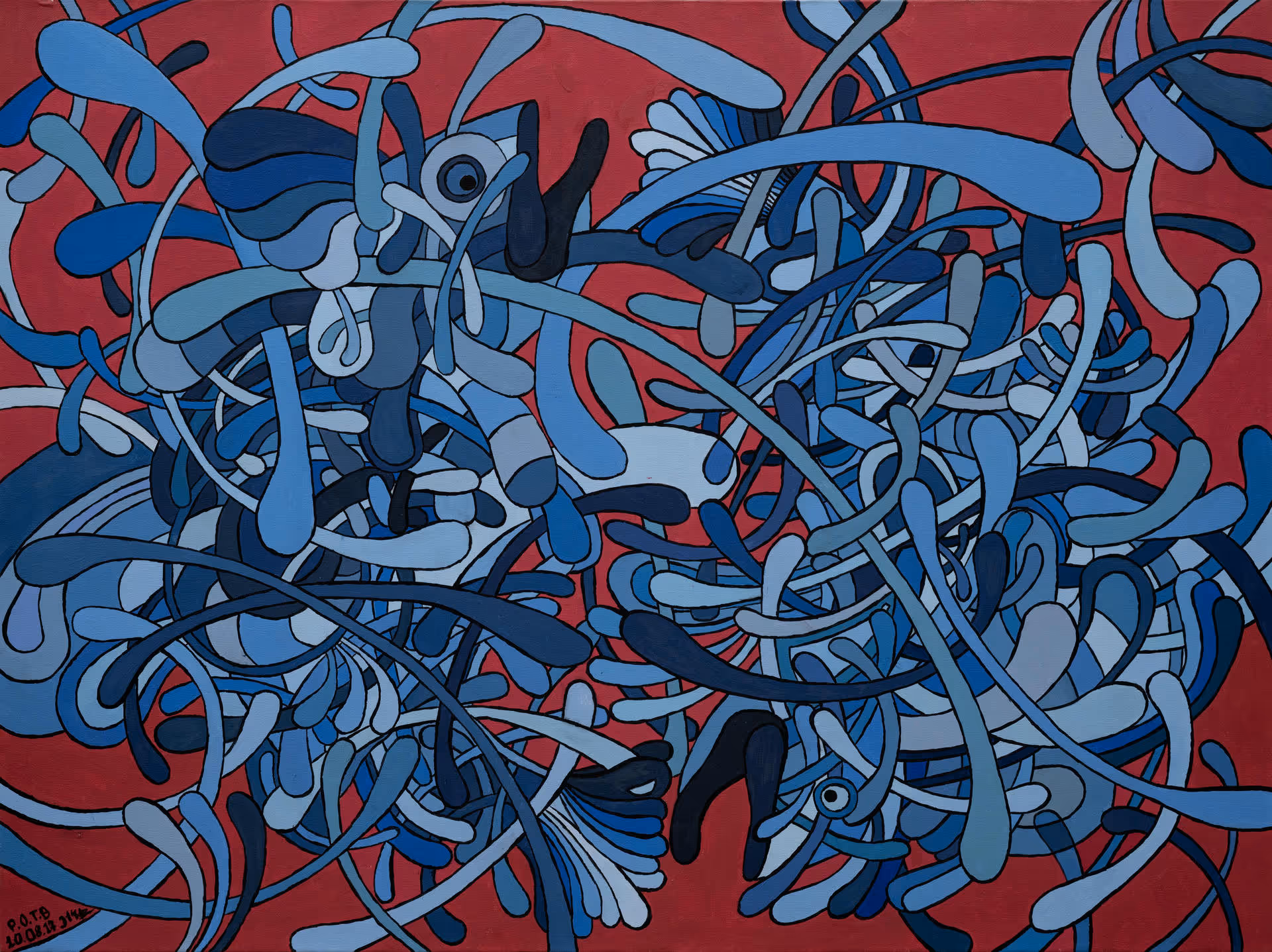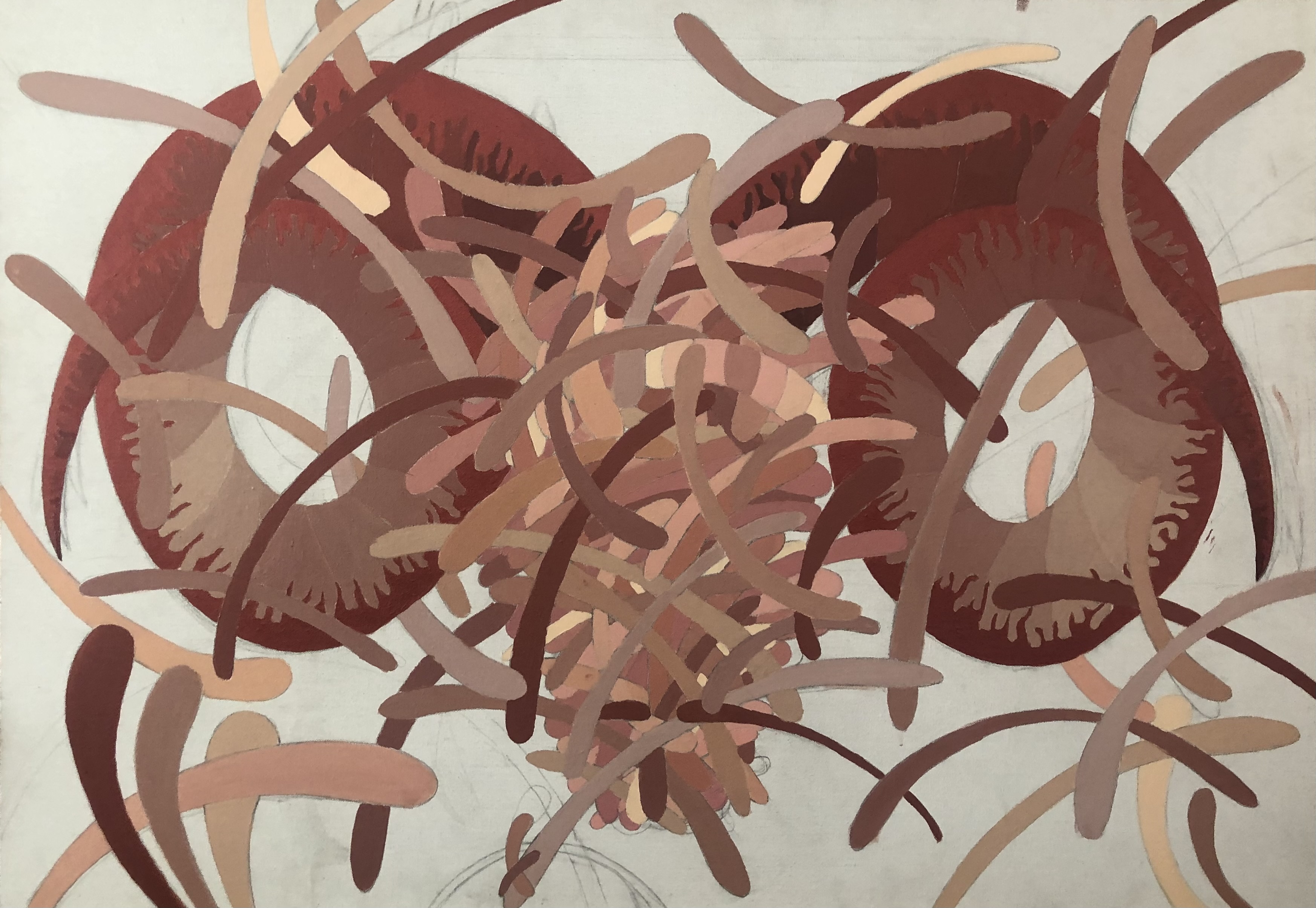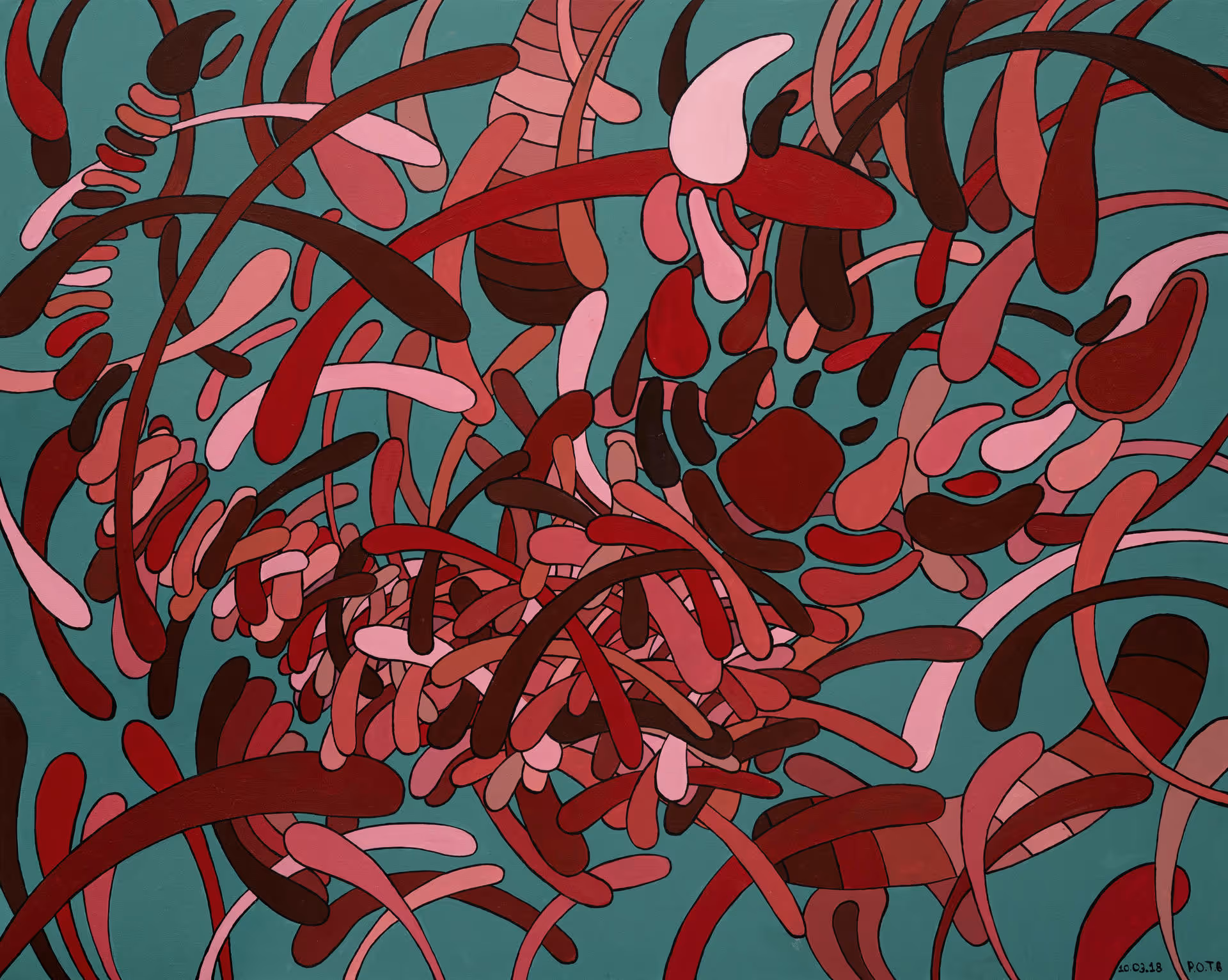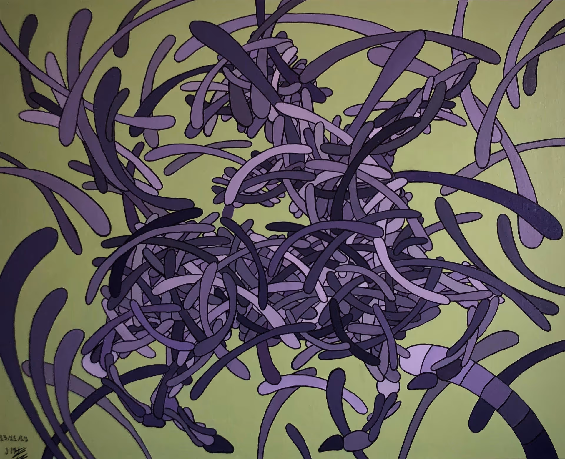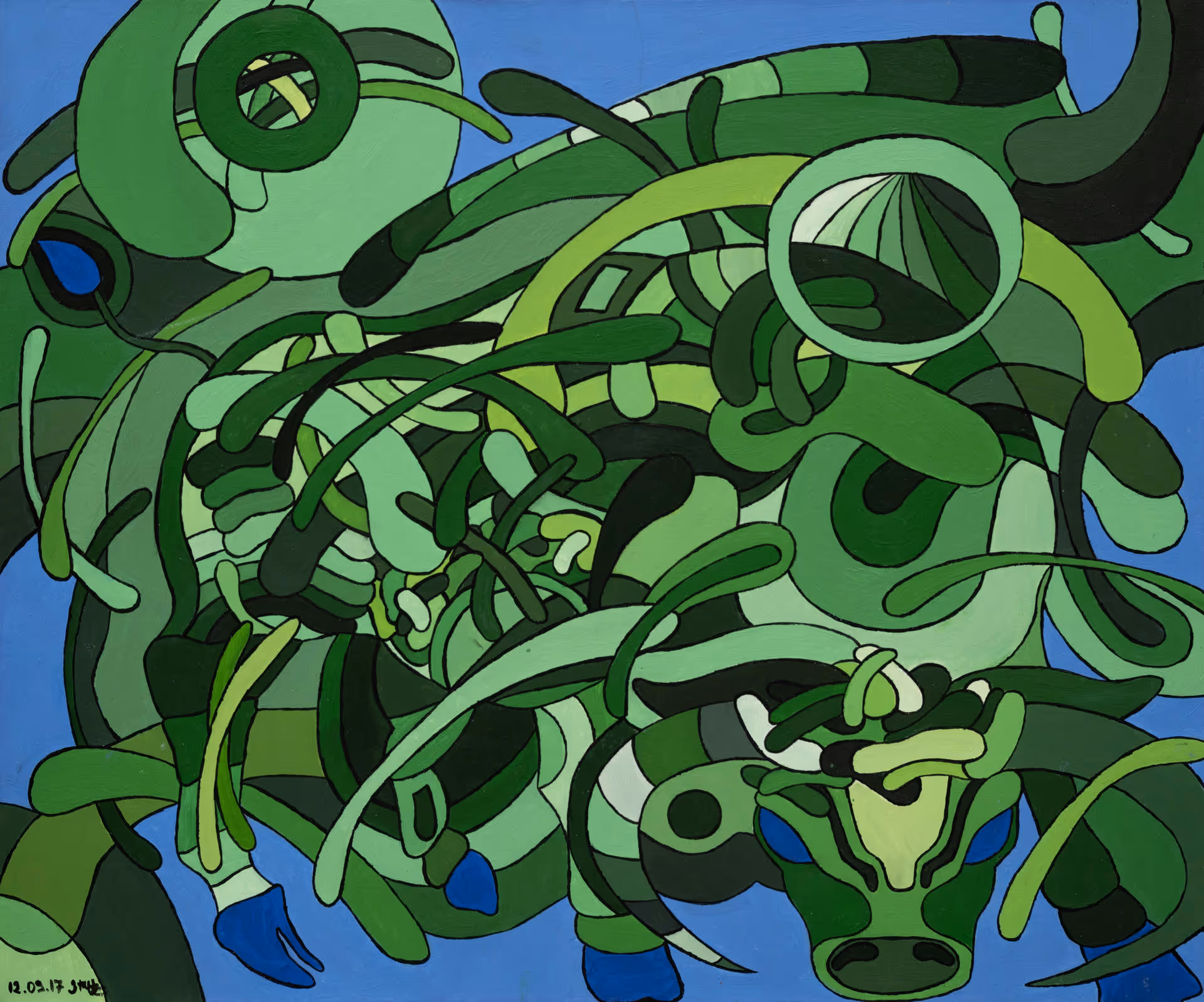 Taurus began as a spontaneous sketch following a conversation with the artist’s grandmother. It is Bokeria’s sign, and the painting explores Taurus’ grounded, enduring nature through heavy forms and the use of green, referencing jade, the sign’s lucky stone.