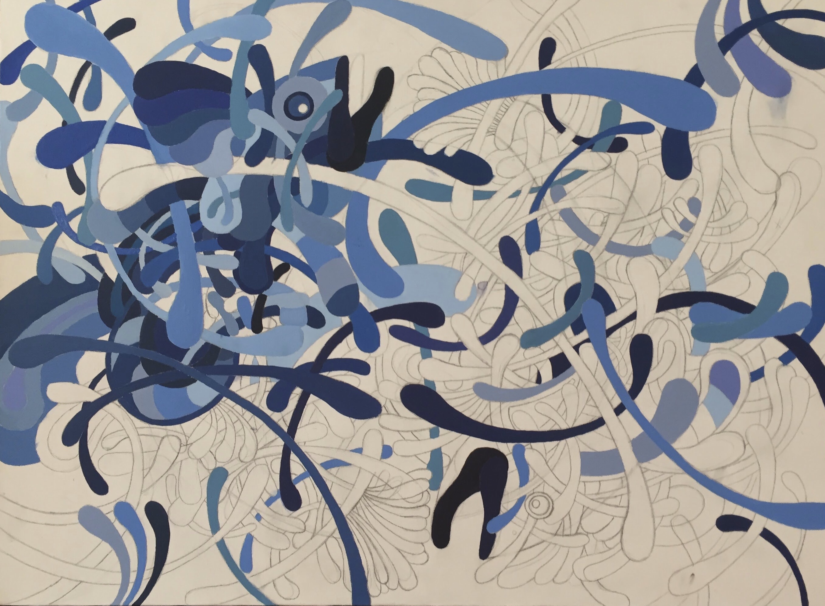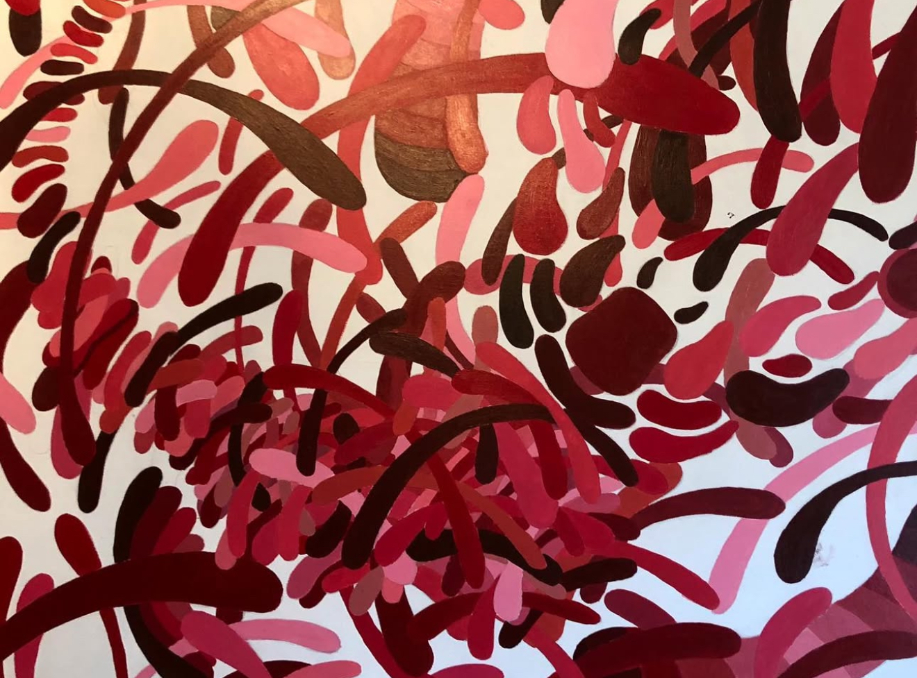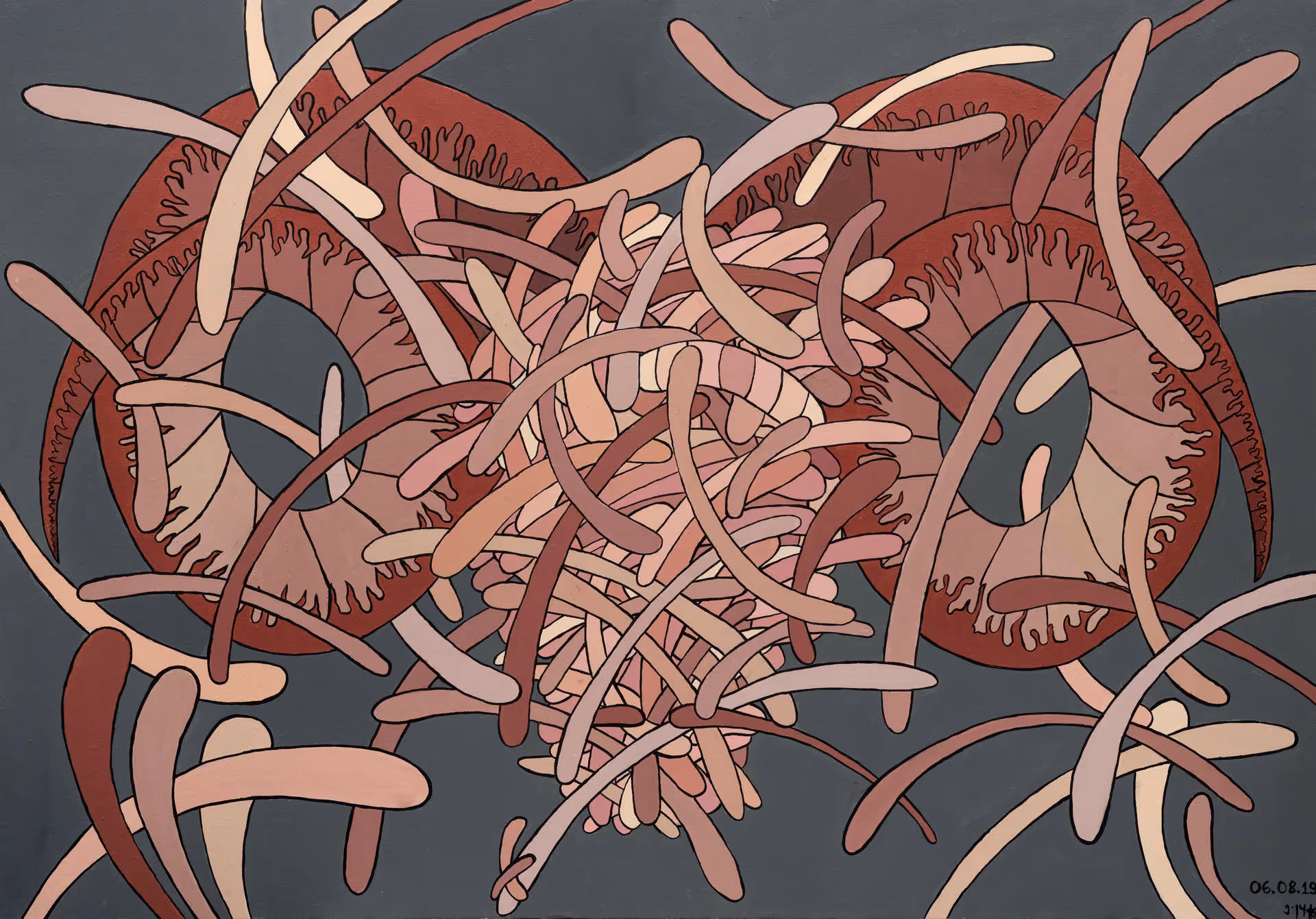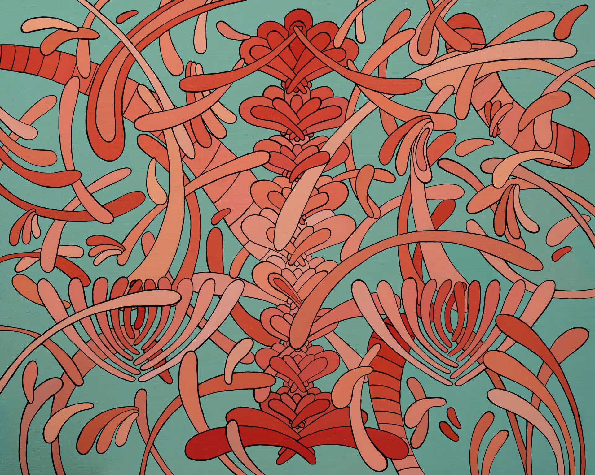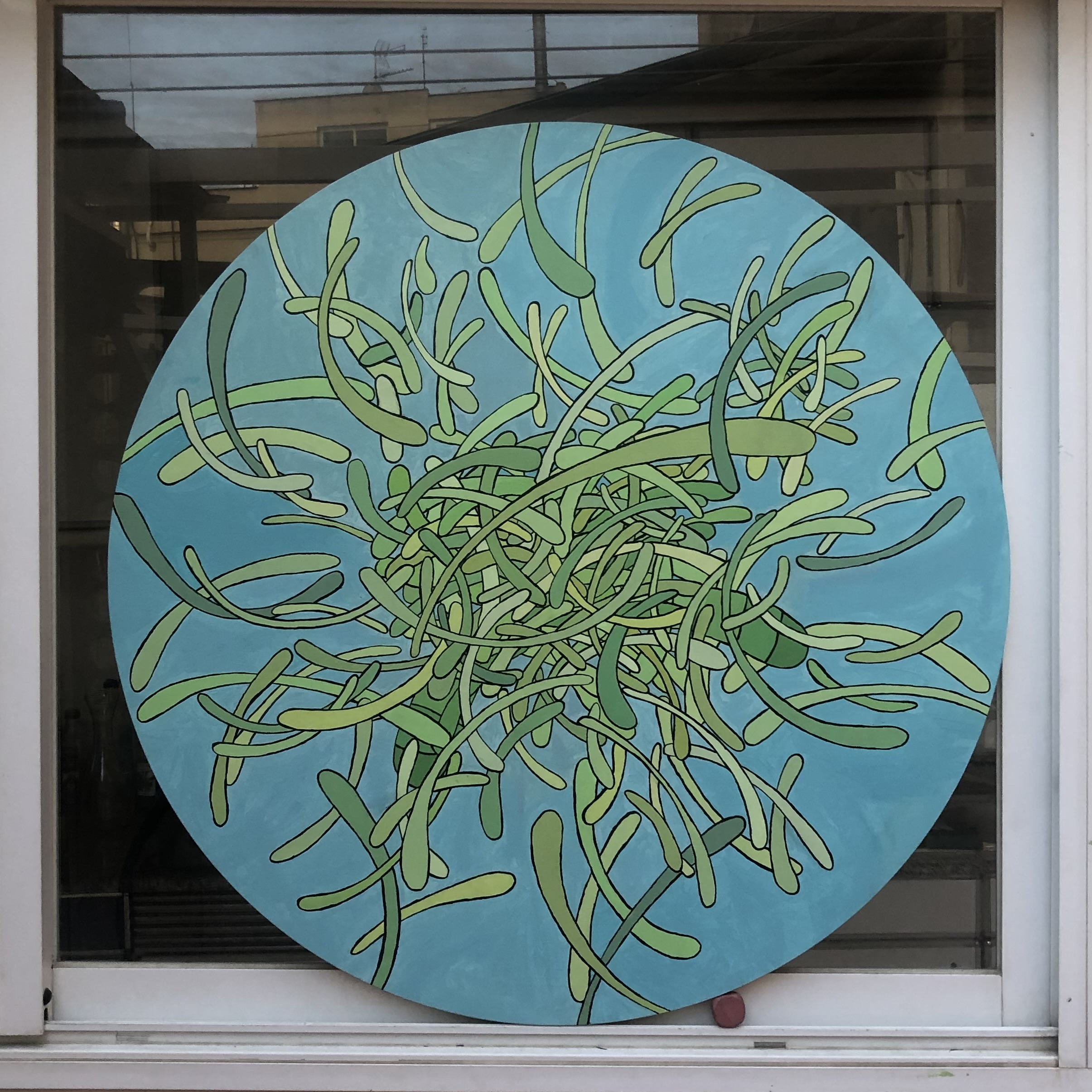 Taurus began as a spontaneous sketch following a conversation with the artist’s grandmother. It is Bokeria’s sign, and the painting explores Taurus’ grounded, enduring nature through heavy forms and the use of green, referencing jade, the sign’s lucky stone.